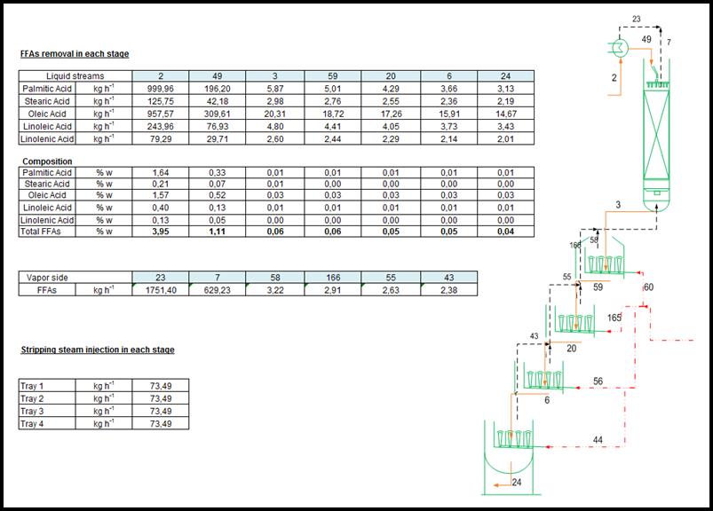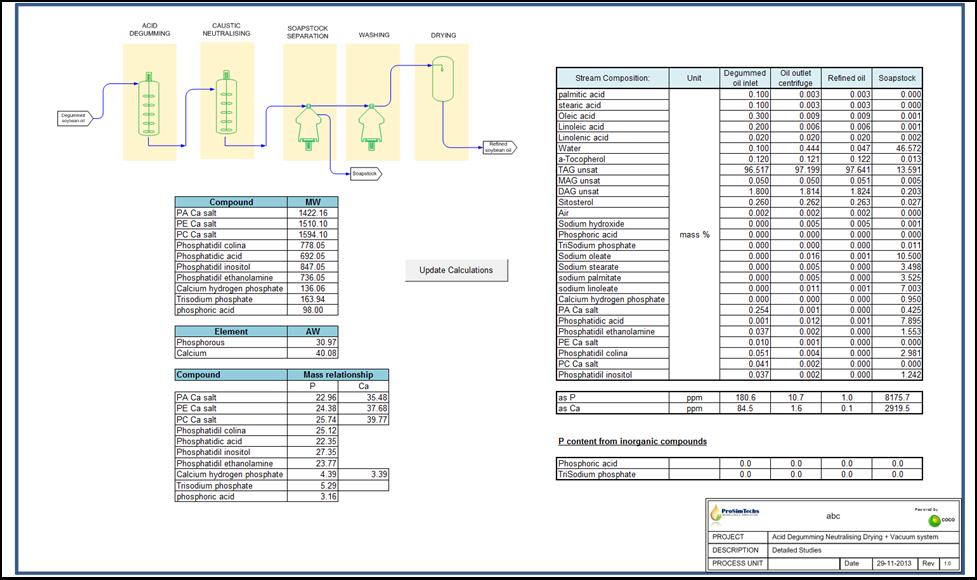 It is a common practice to measure P concentration in outlet oil at Washing Separator, as a tracer to determine phospholipid mass concentration in the outlet stream, which strictly talking it is dependent on MW of phospholipids. Considering atomic weight (AW) of Phosphorous (P) is 31, then we can calculate what is the value of P concentration we can expect in each stream. |