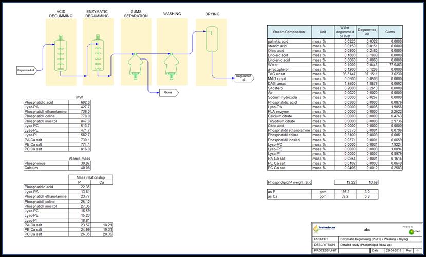 A process simulation model of water degumming allows to control oil yield comparing gums composition vs. expected results from the simulation run, also to check heating steam consumption and residual water concentration in degummed oil. |