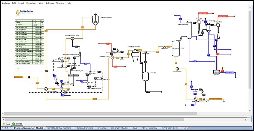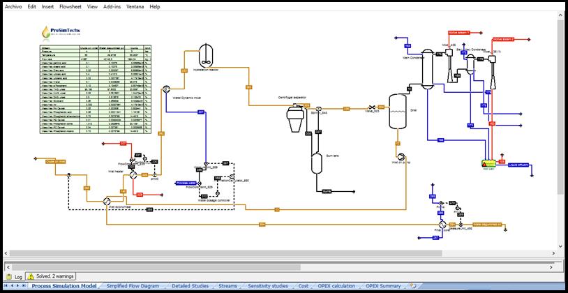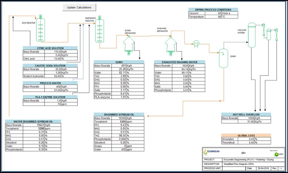 A Simplified Flow Diagram is used to analyze relevant information from the process simulation in terms of stream composition (inlet oil, gums, outlet oil), oil yield, wastewater, etc. |